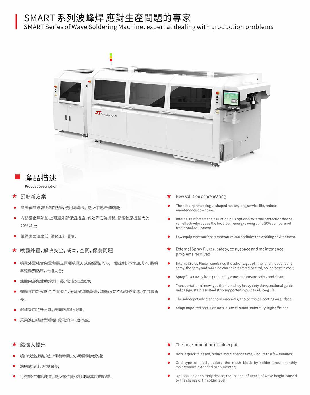 噴霧外置結合內置和獨立兩種噴霧方式的優點,可以一體控制將噴霧遠離預熱區,杜絕禍患。爐體內部免受助焊劑干擾,電箱安全清潔。為四段預熱節省空間的同時減少前段接駁臺的使用。外置噴霧導軌角度可調,代替入口接駁功能。熱風預熱改裝U型發熱管,使用壽命長內部強化隔熱加上可選外部保溫措施,有效降低熱損耗。設備表面溫度…