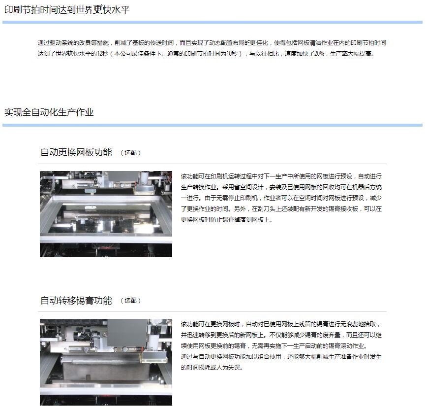 YSP10 高端印刷機1.印刷節拍時間達到世界更快水平,實現全自動化生產作業。2.超高速印刷性能 包括網板清潔作業:12sec/cycle / 10sec/cycle3.重復定位精度:6σ : ±0.01mm4.支持大型基板:L510 x W510mm [選購品: L650 x W510mm]5.網板尺寸:MAX.750×750mm